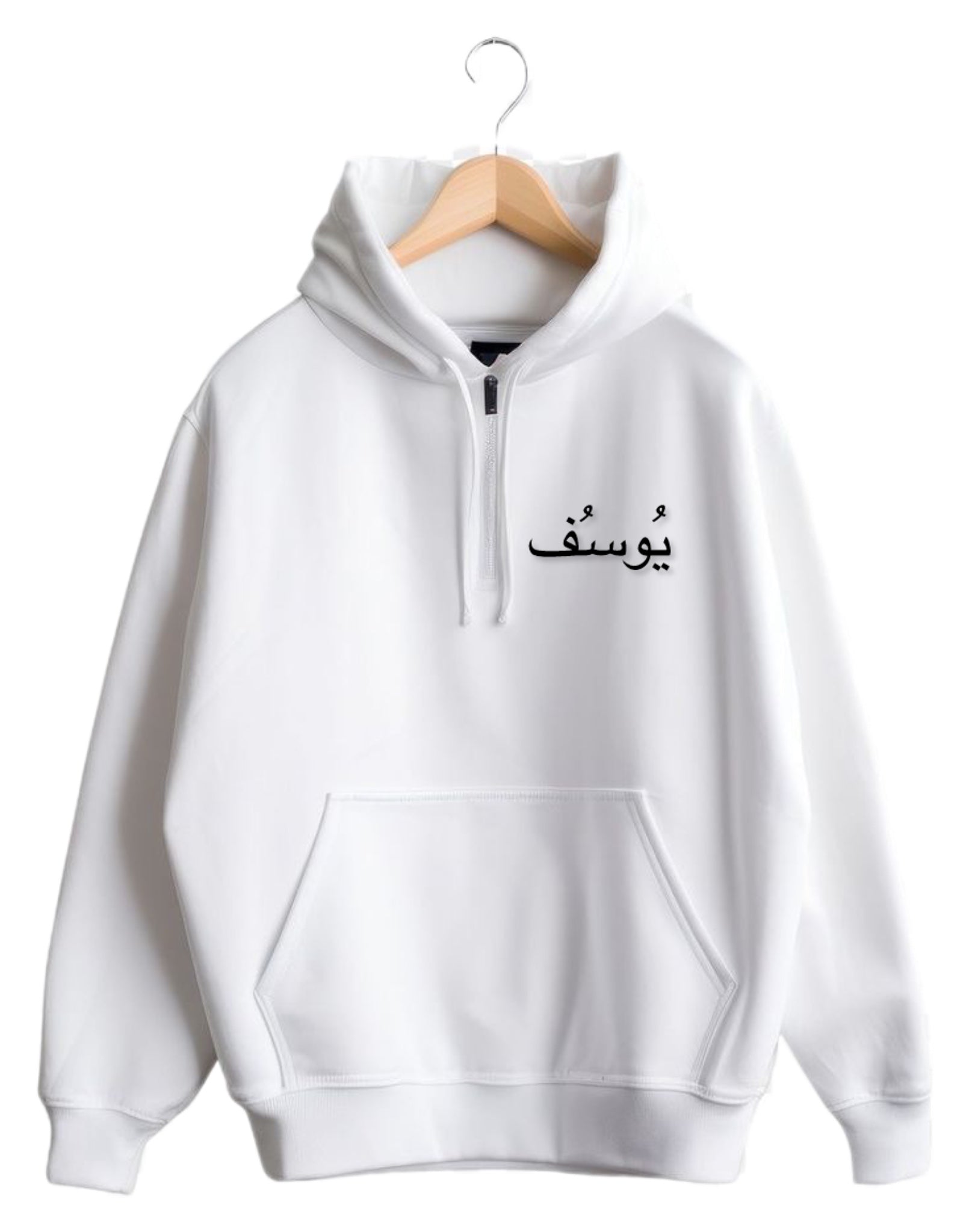 Each hoodie is designed with your personalized Arabic name printed or embroidered in premium calligraphy styles — Thuluth, Kufi, or Diwani — creating a look that’s both modern and meaningful.